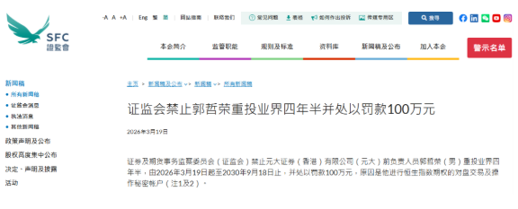 证券及期货事务监察委员会(香港证监会)不容元大证券(香港)有限公司(YuantaSecurities(HongKong)CompanyLimited)(元大)前正经东谈主员(formerresponsibleofficer)郭哲荣(MrKuoChe-jung)(男)重投业界四年半,由2026年3月19日起至2030年9月18日止,并处以罚金100万港元,原因是他进行恒生指数期权的对盘走动及操作深沉帐户(注1及2)。