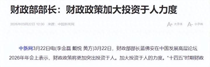3月22日,中国发展高层论坛2026年年会在北京召开,财政部部长蓝佛何在会上明确把“投资于东谈主”这四个字当作本年财政计谋的中枢标的。