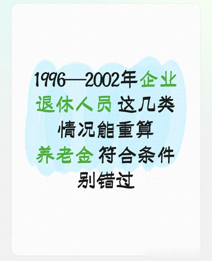 连结各地社保部门的办理细目,以及多数实质办理案例,1996-2002年企业退休东说念主员,只消属于以下几类情况,准备好研究材料,就能肯求待业金重算,审核通事后,会一次性补发漏发的差额,后续每月按再行核算后的表率披发。