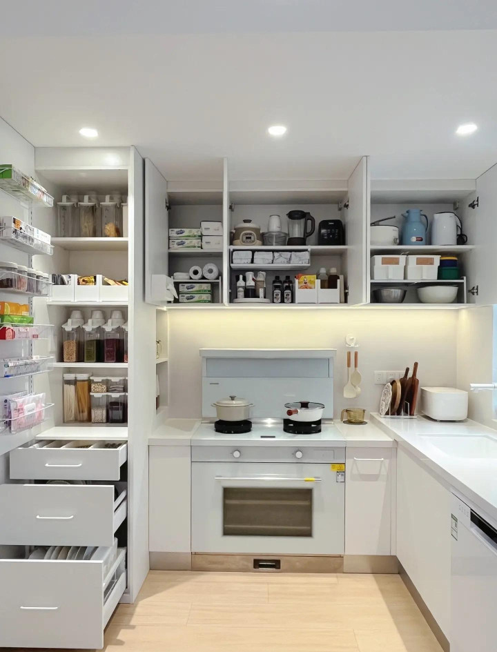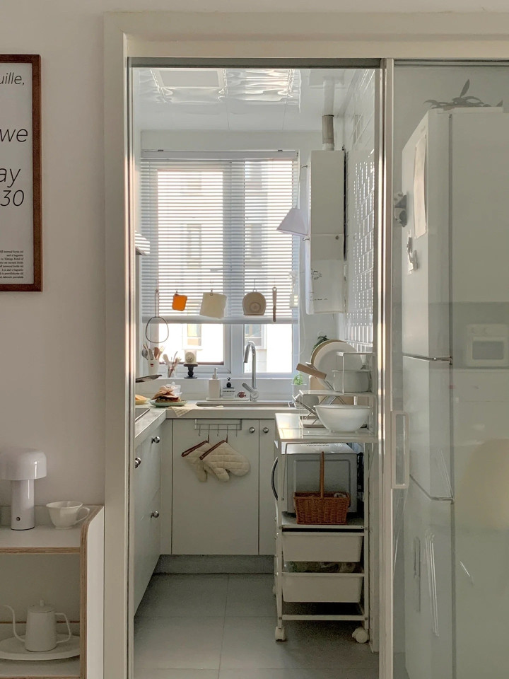 精装房的厨房广阔是“L型”或“一字型”,台面顾此失彼,顾此失彼。加一个可转移的置物架或折叠切菜板,不占地又能多出操作空间。墙上多用挂杆和挂钩,把锅铲、调料瓶上墙,台面立马显现。