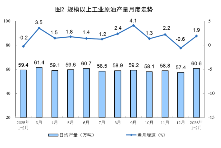 原油出产由降转增。1—2月份,规上工业原油产量3573万吨,B体育同比增长1.9%,2025年12月份为着落0.6%;日均产量60.6万吨。